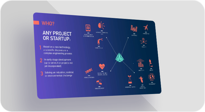 WHO? ADVANCED COMPUTING AERONAUTICS & AI NEW SPACE CYBERSECURITY ANY PROJECT & COMMUNICATION OR STARTUP: MOBILITY 1 Based on a new technology, INDUSTRY 4.0 a scientiļ¬c discovery or a complex engineering process 2 In early-stage development (up to series A or projects not yet incorporated) Solving an industrial, societal SMART CITY ENERGY 3 DIGITAL HEALTH & or environmental challenge MEDICAL DEVICES MEDICAL BIOTECH ENVIRONMENT DRUG DISCOVERY INDUSTRIAL BIOTECH FOOD & AGRICULTURE