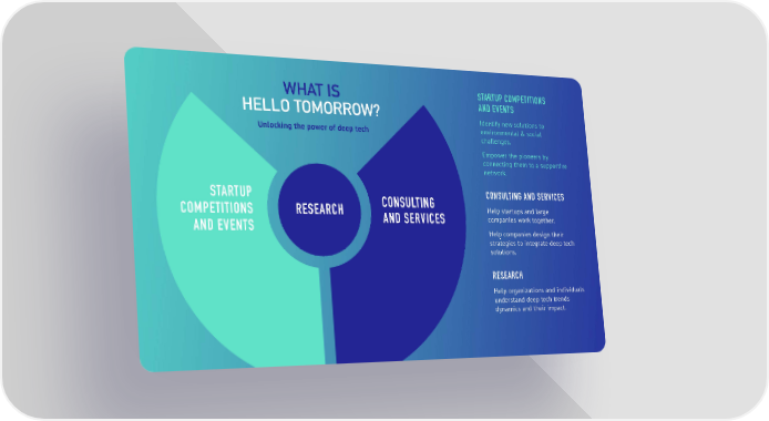 WHAT IS STARTUP COMPETITIONS HELLO TOMORROW? AND EVENTS Identify new solutions to Unlocking the power of deep tech environmental & social challenges. Empower the pioneers by connecting them to a supportive network. STARTUP CONSULTING CONSULTING AND SERVICES COMPETITIONS RESEARCH Help startups and large AND EVENTS AND SERVICES companies work together. Help companies design their strategies to integrate deep tech solutions. RESEARCH Help organizations and individuals understand deep tech trends dynamics and their impact.