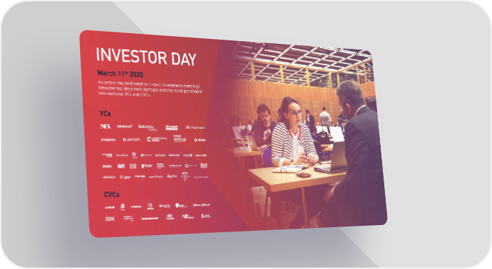INVESTOR DAY th March 11 2020 An entire day dedicated to 1-on-1 investment meetings between top deep tech startups and the most prominent International VCs and CVCs. VCs and many more CVCs