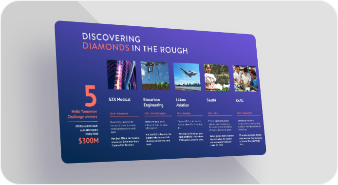 DISCOVERING DIAMONDS IN THE ROUGH 5 GTX Medical Biocarbon Lilium Saathi RxAll Engineering Aviation Hello Tomorrow 2014 - Switzerland 2015 - United Kingdom 2016 - Germany 2017 - India 2019 - Nigeria/USA Challenge winners Developing implants for Using drones to plant The world’s first all-electric Producing biodegradable Developing handheld OTHER ALUMNI HAVE the spinal chord to enable billions of trees for mass vertical take-off and landing sanitary care from banana nanoscanners assessing drug ALREADY RAISED paraplegic people to walk reforestation. jet. fibre aiming to help millions quality in real time to combat MORE THAN again. of women across the globe. fake drugs. Met the CEO of Parrot at the Winning the Challenge gave $300M Met their CEO at the Summit, Summit who became their them credibility - they raised Gained global media exposure 30 articles published directly who raised $36M with them strategic partner the same $100 million after the event. from attending the Summit after their win (Fast Company, 2 years after the event. week. and was named Forbes 30 Le Monde, Deutsche Welle, under 30 2018. etc.)