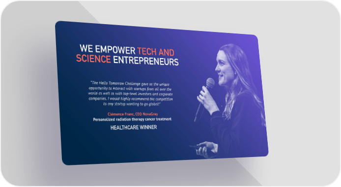 WE EMPOWER TECH AND SCIENCE ENTREPRENEURS “The Hello Tomorrow Challenge gave us the unique opportunity to interact with startups from all over the world as well as with top-level investors and corporate companies. I would highly recommend the competition to any startup wanting to go global!” Clémence Franc, CEO NovaGray Personalized radiation therapy cancer treatment HEALTHCARE WINNER