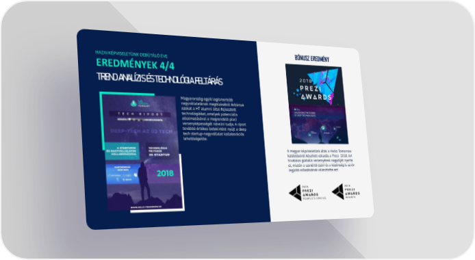 BÓNUSZ EREDMÉNY HAZAI KÉPVISELETÜNK DEBÜTÁLÓ ÉVE EREDMÉNYEK 4/4 TREND ANALÍZIS ÉS TECHNOLÓGIA FELTÁRÁS Magyarország egyik legismertebb nagyvállalatának megbízásából feltártuk azokat a HT alumni által fejlesztett technológiákat, amelyek potenciális alkalmazásával a megrendelő piaci versenyképességét növelni tudja. A riport továbbá értékes betekintést nyújt a deep tech startup-nagyvállalat kollaborációs lehetőségekbe. A magyar képviseletünk által a Hello Tomorrow küldetéséről készített előadás a Prezi 2018. évi hivatalos globális versenyének nagydíját nyerte el, miután a szakértő zsűri és a közönség is az év legjobb előadásának választotta azt.