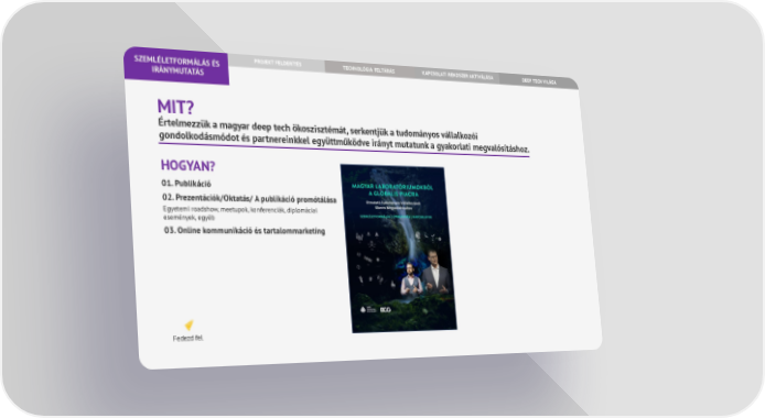 PROJEKT FELDERÍTÉS KAPCSOLATI RENDSZER AKTIVÁLÁSA TECHNOLÓGIA FELTÁRÁS DEEP TECH VILÁGA SZEMLÉLETFORMÁLÁS ÉS IRÁNYMUTATÁS MIT? Értelmezzük a magyar deep tech ökoszisztémát, serkentjük a tudományos vállalkozói gondolkodásmódot és partnereinkkel együttműködve irányt mutatunk a gyakorlati megvalósításhoz. HOGYAN? 01. Publikáció 02. Prezentációk/Oktatás/ A publikáció promótálása Egyetemi roadshow, meetupok, konferenciák, diplomáciai események, egyéb 03. Online kommunikáció és tartalommarketing Fedezd fel