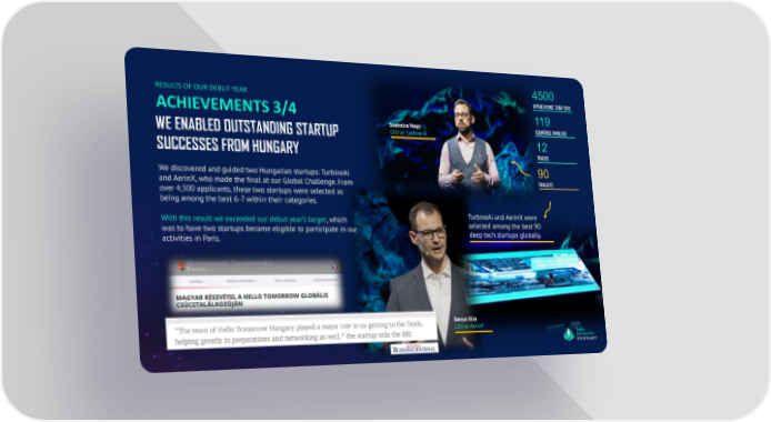 RESULTS OF OUR DEBUT YEAR ACHIEVEMENTS 3/4 Szabolcs Nagy WE ENABLED OUTSTANDING STARTUP CEOatTurbineAi SUCCESSES FROM HUNGARY We discovered and guided two Hungarian startups: TurbineAi and AerinX, who made the final at our Global Challenge. From over 4,500 applicants, these two startups were selected as being among the best 6-7 within their categories. With this result we exceeded our debut year’s target, which TurbineAi and AerinX were was to have two startups become eligible to participate in our selected among the best 90 activities in Paris. deep tech startups globally. BenceKiss CEOatAerinX