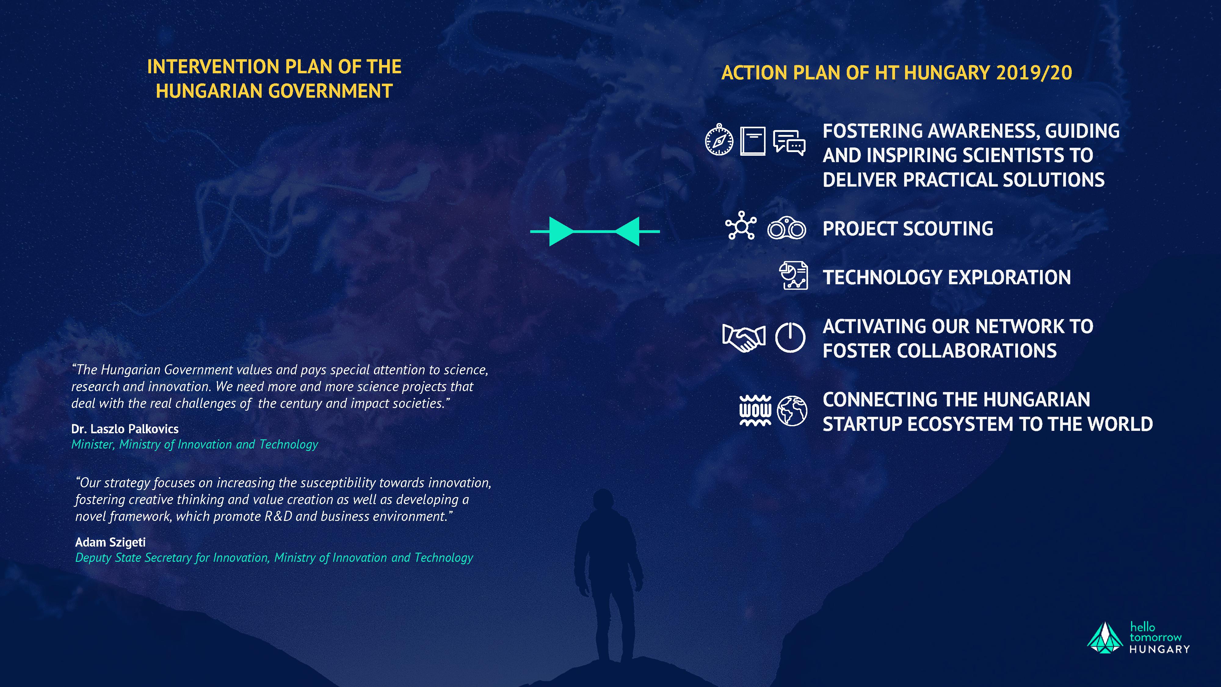 INTERVENTION PLAN OF THE ACTION PLAN OF HT HUNGARY 2019/20 HUNGARIAN GOVERNMENT FOSTERING AWARENESS, GUIDING AND INSPIRING SCIENTISTS TO DELIVER PRACTICAL SOLUTIONS PROJECT SCOUTING TECHNOLOGY EXPLORATION ACTIVATING OUR NETWORK TO FOSTER COLLABORATIONS “The Hungarian Government values and pays special attention to science, research and innovation. We need more and more science projects that CONNECTING THE HUNGARIAN deal with the real challenges of the century and impact societies.” Dr. Laszlo Palkovics STARTUP ECOSYSTEM TO THE WORLD Minister, Ministry of Innovation and Technology “Our strategy focuses on increasing the susceptibility towards innovation, fostering creative thinking and value creation as well as developing a novel framework, which promote R&D and business environment.” AdamSzigeti Deputy State Secretary for Innovation, Ministry of Innovation and Technology