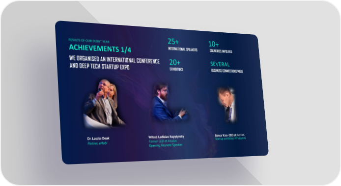 RESULTS OF OUR DEBUT YEAR 25+ 10+ ACHIEVEMENTS 1/4 INTERNATIONAL SPEAKERS COUNTRIES INVOLVED WE ORGANISED AN INTERNATIONAL CONFERENCE 20+ SEVERAL AND DEEP TECH STARTUP EXPO EXHIBITORS BUSINESS CONNECTIONS MADE Dr.Laszlo Deak Witold Ladislao Kopytynsky BenceKiss-CEOatAerinX Partner,eMobi Former CEO at Arculus Startup exhibitor,HT alumni Opening Keynote Speaker