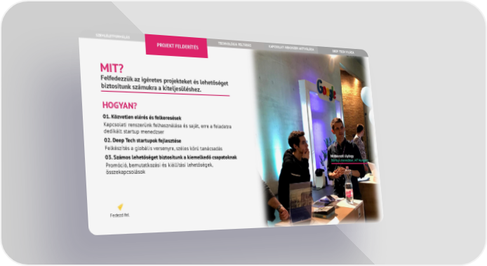 KAPCSOLATI RENDSZER AKTIVÁLÁSA TECHNOLÓGIA FELTÁRÁS DEEP TECH VILÁGA SZEMLÉLETFORMÁLÁS PROJEKT FELDERÍTÉS MIT? Felfedezzük az ígéretes projekteket és lehetőséget biztosítunk számukra a kiteljesüléshez. HOGYAN? 01. Közvetlen elérés és felkeresések Kapcsolati renszerünk felhasználása és saját, erre a feladatra dedikált startup menedzser 02. Deep Tech startupok fejlesztése Felkészítés a globális versenyre, széles körű tanácsadás Hrabovszki György 03. Számos lehetőséget biztosítunk a kiemelkedő csapatoknak Startup menedzser, HT Hungary Promóció, bemutatkozási és kiállítási lehetőségek, összekapcsolások Fedezd fel